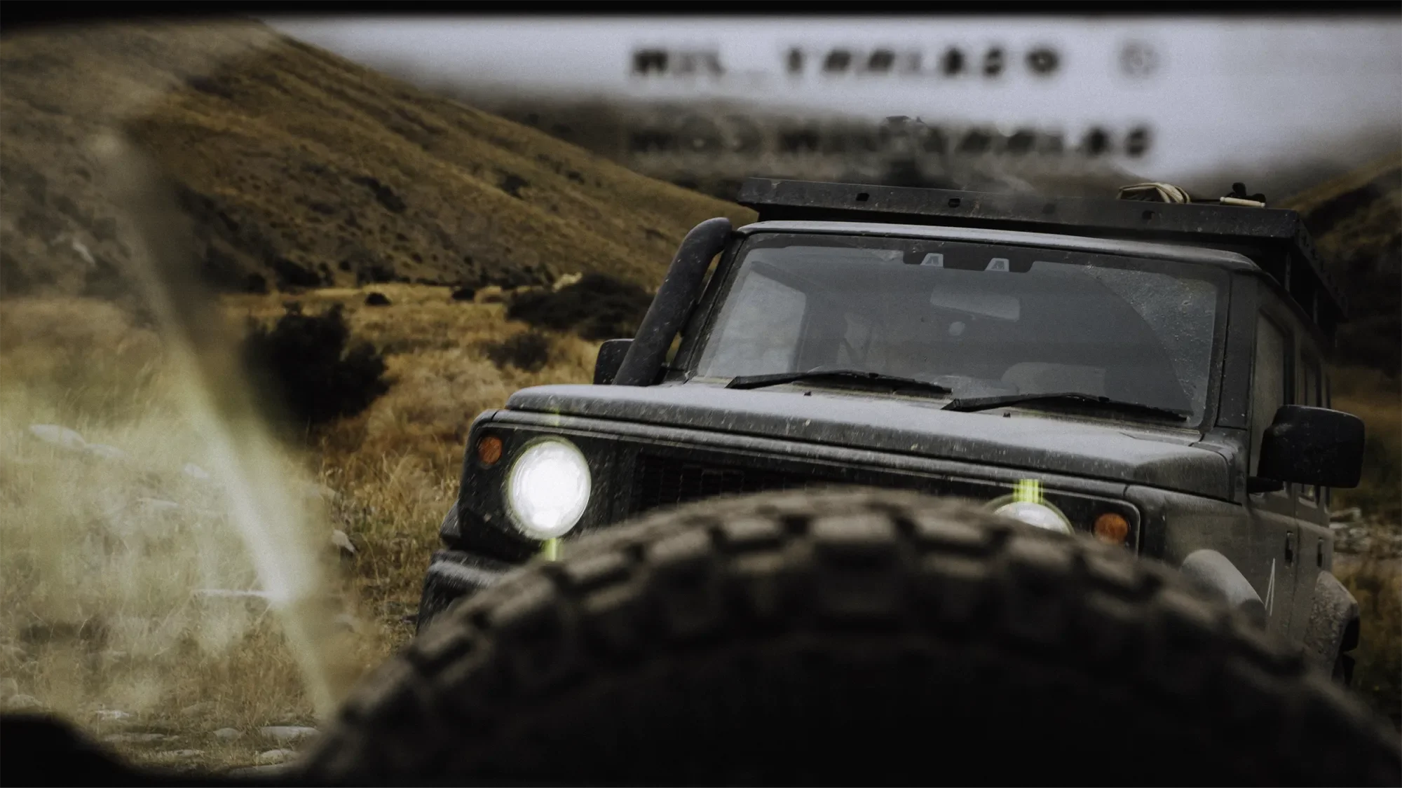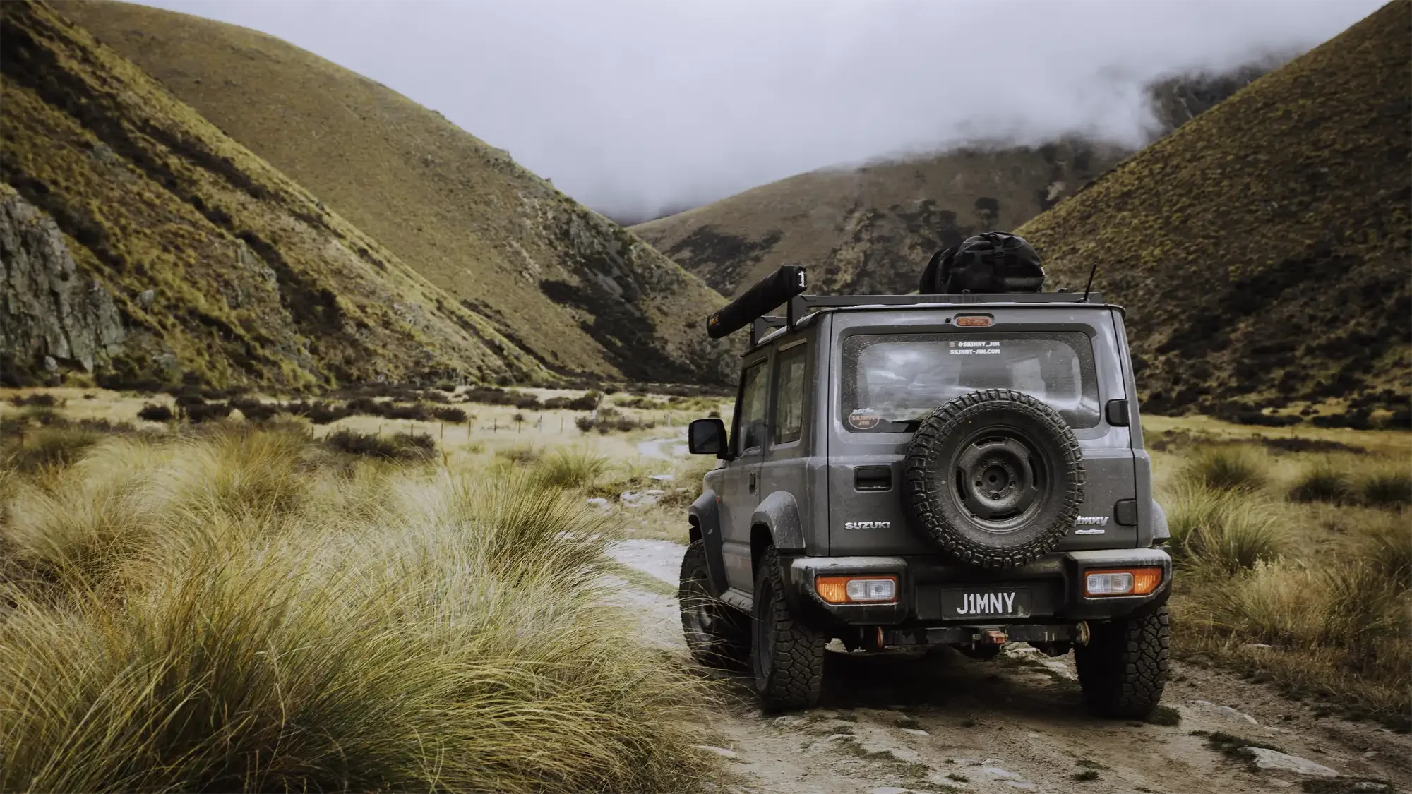 Rear of 'Skinny Jim' branded Suzuki Jimny covered in dirt on alpine offroad track