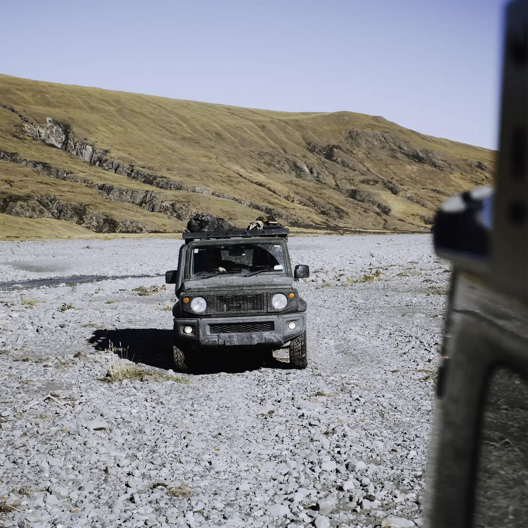 Jimny on rocky alpine terrain with aftermarket grill, snorkel and roof rack