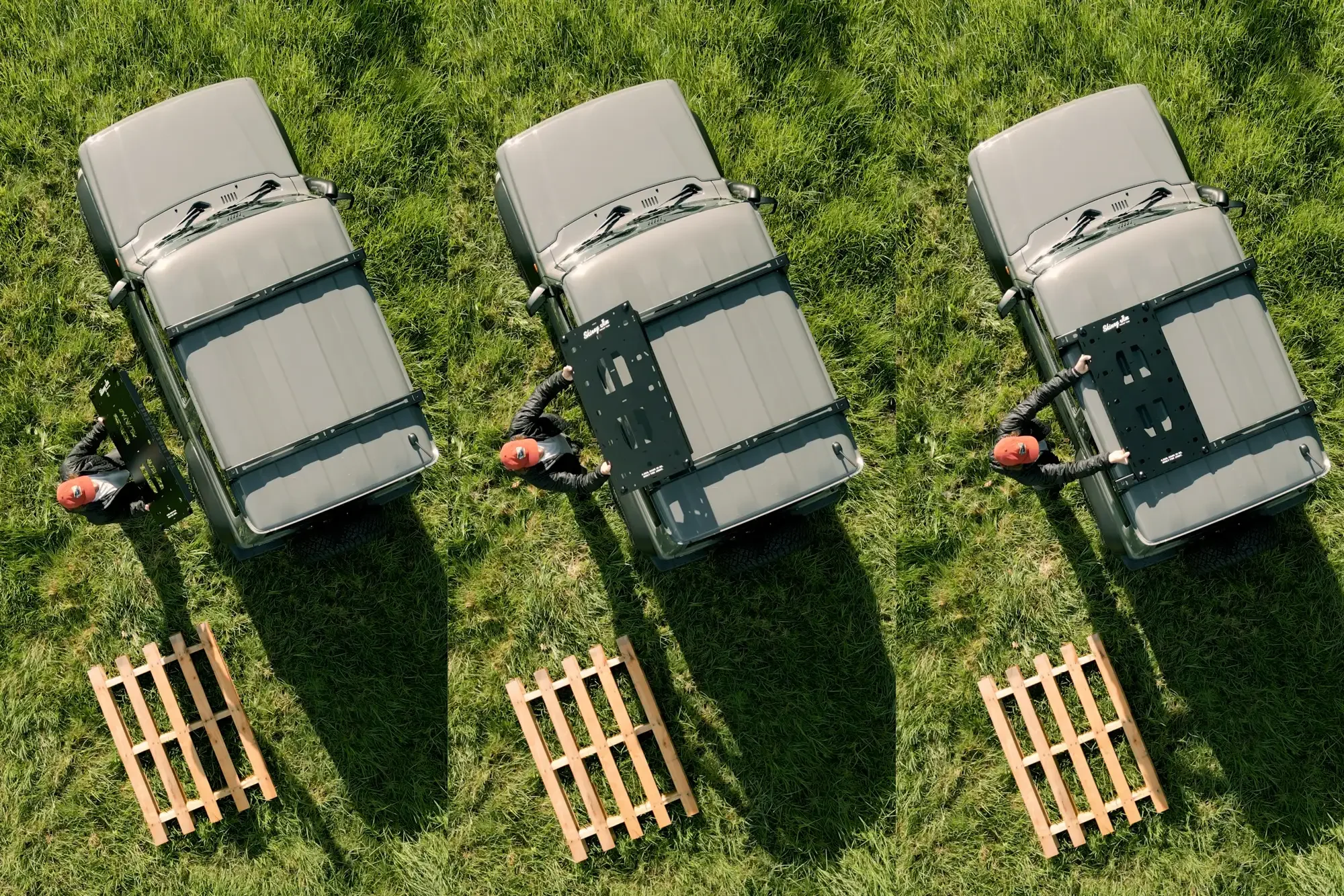 From nimble navigator, to adventure-ready rig in a couple of minutes. It’s a doable job alone, but more fun with a mate.
